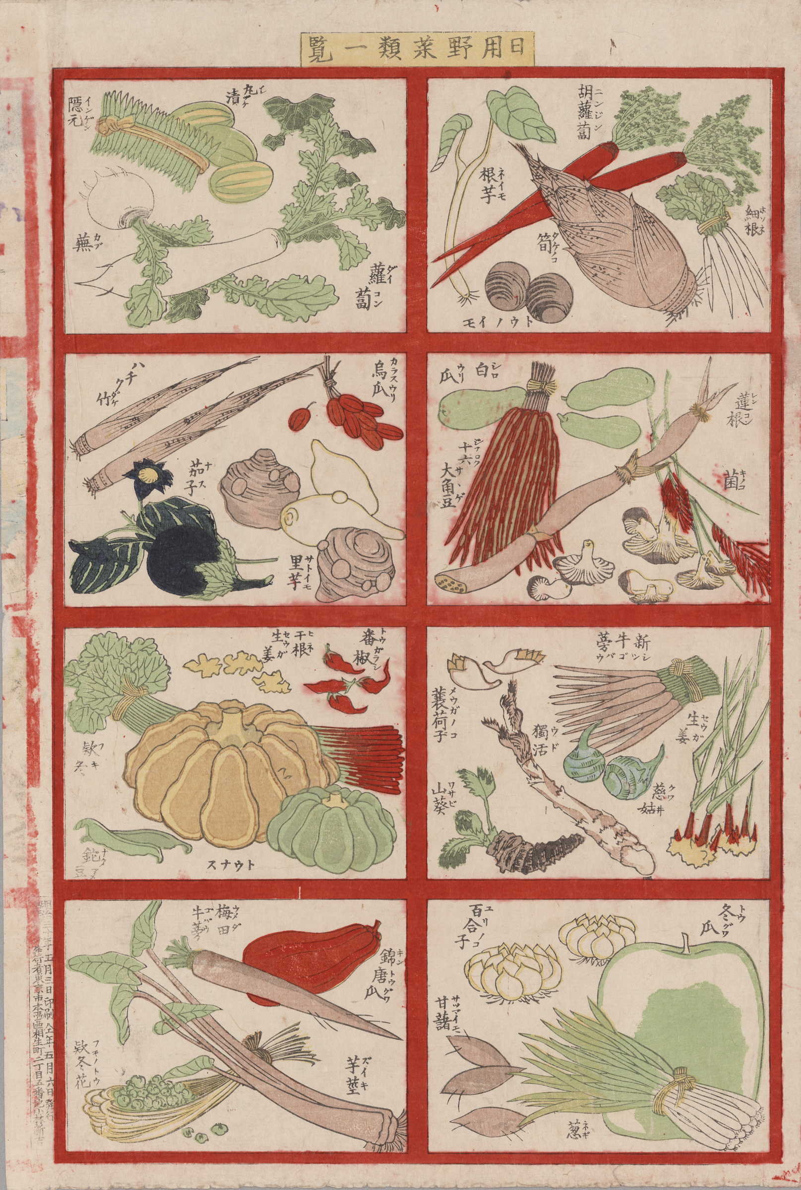 おもちゃ絵。大根、人参、筍など野菜がその読み方とともに描かれる。合羽摺ならではの痕跡も残っている。